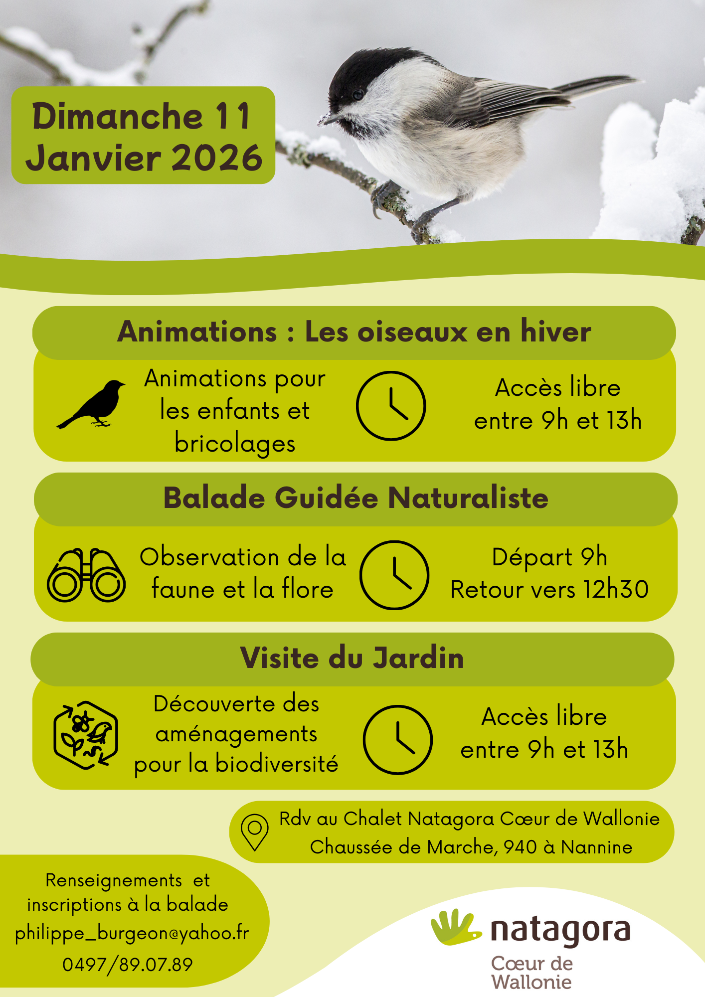 Les jardins d'ici Ateliers, stages et animations La Régionale Coeur de Wallonie ouvre on chalet/local ce dimanche sur le thème des oiseaux en hiver. Une balade guidée est organisée en parallèle dans le environs du chalet. Retour à la liste 11 jan Date Dimanche 11 janvier 2026 de 09:00 à 13:00 Organisateur Natagora Coeur de Wallonie Adresse Les jardins d'ici 940 Chaussée de Marche 5100 Naninne Information Inscription souhaitée avant le 10 janvier SMS ou mail Responsable Philippe Burgeon 0497890789 philippe_burgeon@yahoo.fr Prix 0.00€ ( 0.00€ pour les membres) Equipement et accessibilité Accessible à tout public Jumelles Partenaires CNB Les Sittelles