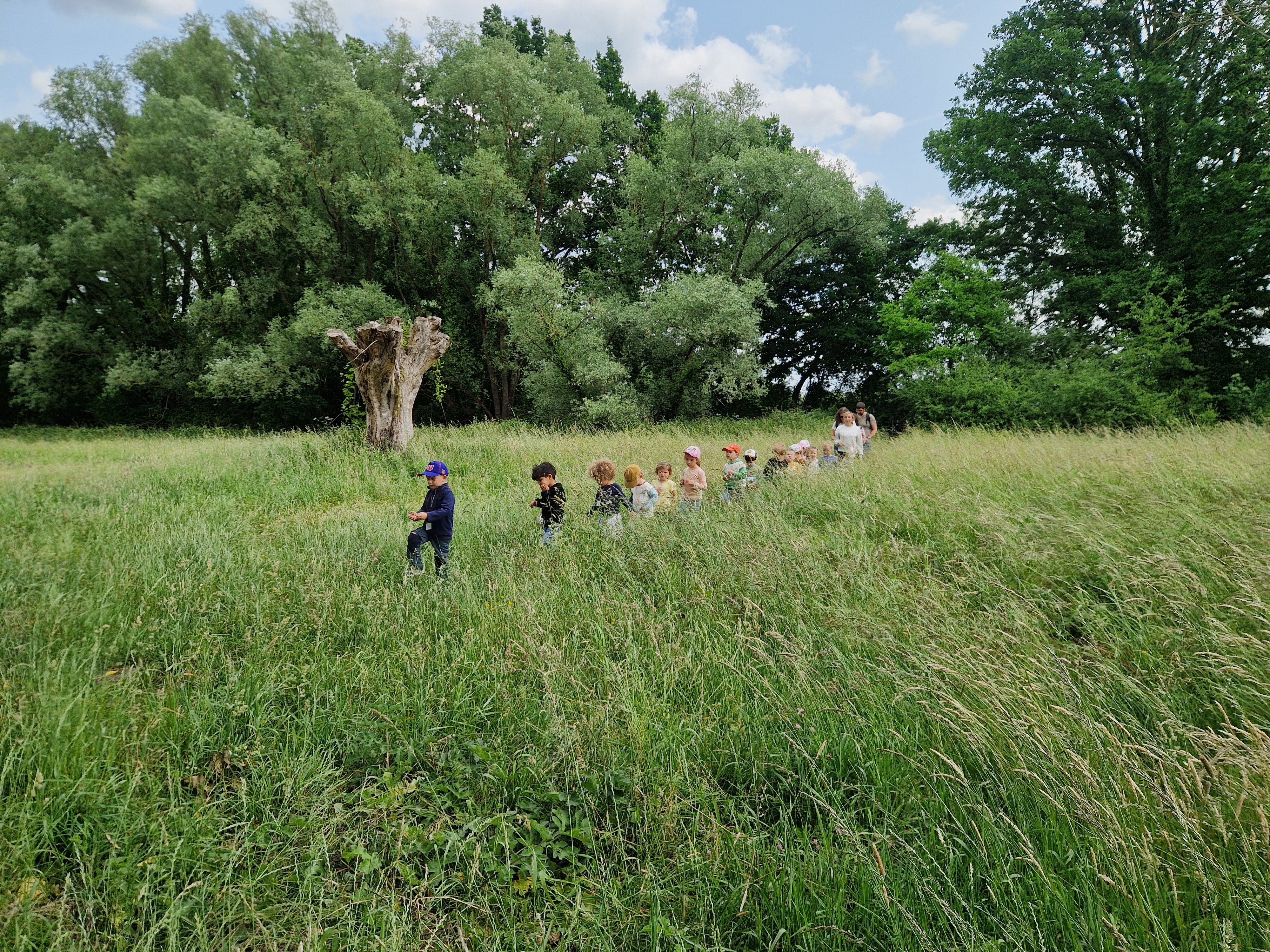 enfants en file indienne dans une prairie, marchant vers l'aventure !