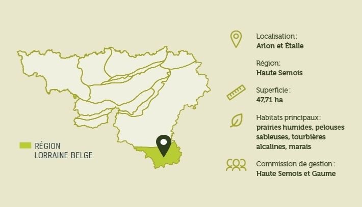 Située en Lorraine belge, elle protège des habitats remarquables : tourbières alcalines, prairies humides, bas-marais, éléments forestiers et pelouses sableuses devenus très rares.